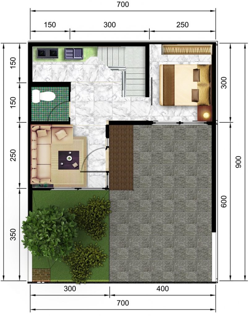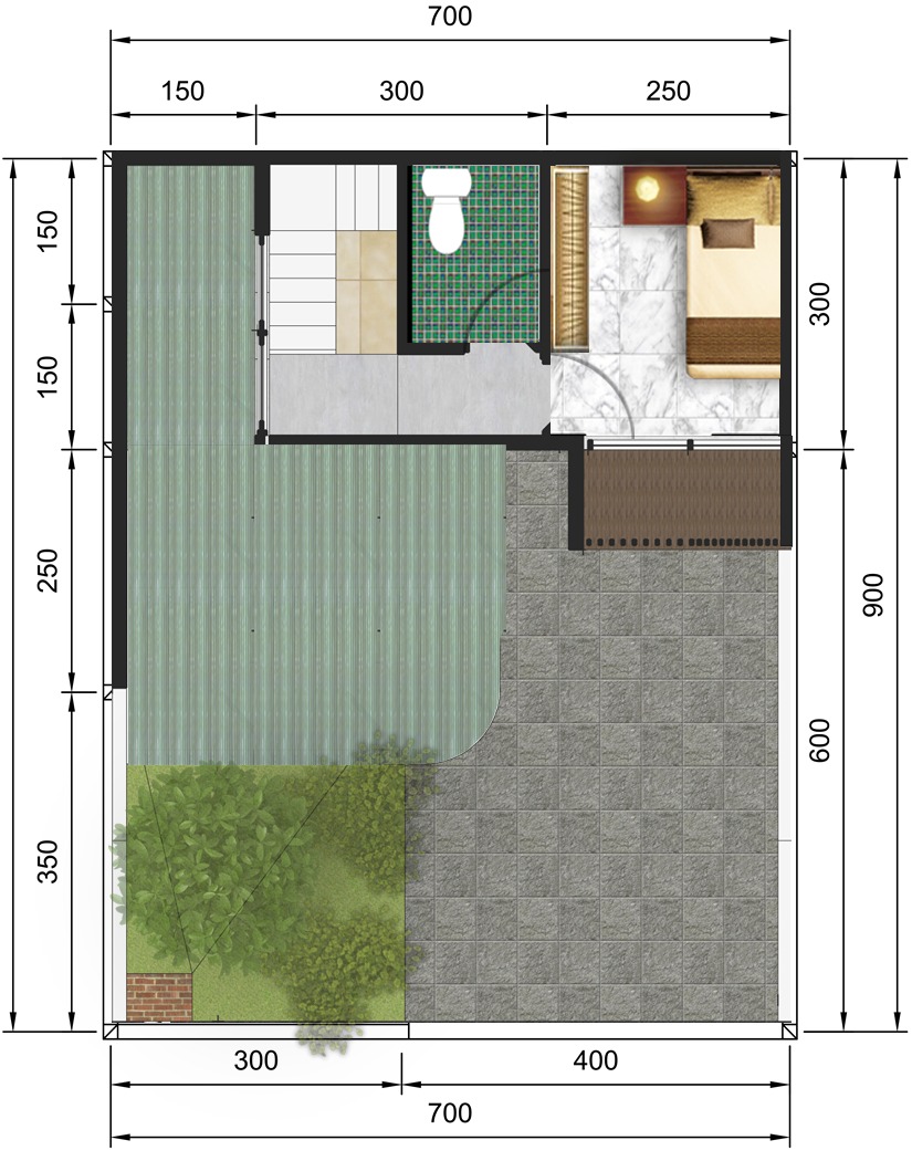 Lantai : Ruang Utama Homogenius Tile 60×60 : KM / WC Keramik Tile 30×30